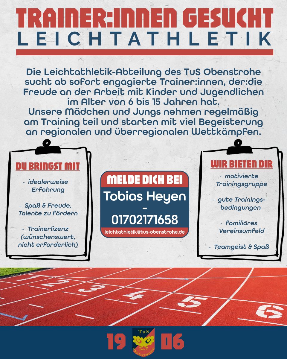 Die Leichtathletik-Abteilung sucht ob sofort engagierte Trainer/innen, die Freude an der Arbeit mit Kindern und Jugendlichen im Alter von 6 bis 15 Jahren haben.